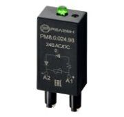 Модуль индикации и защиты, LED, Варистор (240В AC/DC). Используется для защиты обмотки и сигнализации индикации реле. Пики обратного напряжения на катушке гасятся примерно в 2.5 раза от значения номинального напряжения. При использовании катушек DC, + подается на клемму А1. Время спада увеличивается незначительно. Светодиодный индикатор загорается при подаче питания на катушку. Модуль монтируется в розетку.